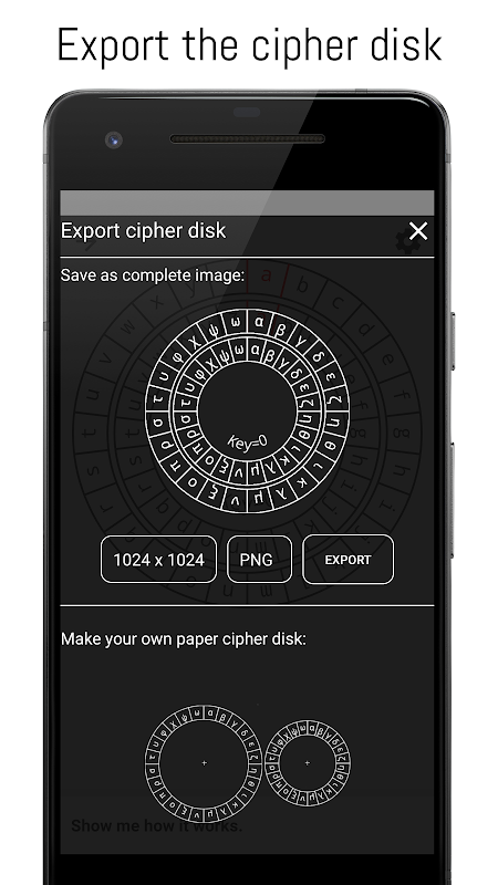 O aplicativo permite criptografar ou descriptografar texto com a cifra de César simples e amplamente conhecida. Se você tiver um texto criptografado Caesar com uma chave desconhecida, o aplicativo pode descriptografar o texto para você! Isso pode ser útil para enigmas ou geocaching. Além disso, o algoritmo é visualizado com um disco de criptografia interativo que você pode exportar e imprimir para criar seu próprio disco de criptografia de papel.