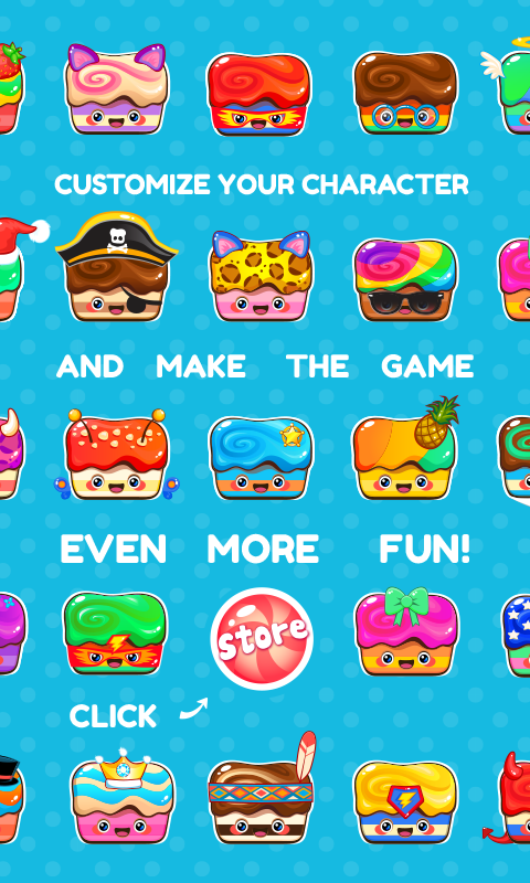 Colete doces e visite a loja de doces para mudar a aparência de seu bolo de aniversário: você pode escolher um novo corpo, cobertura ou decoração para ele. É possível customizar o seu bolo para transforá-lo em um bolo de chocolate ou de frutas, assim como um em forma de anjo, rainha, princesa, pirata, índio ou Halloween. Você ainda pode ganhar mais doces com a ajuda da sacola, jarra, caixa ou caminhão de doces.