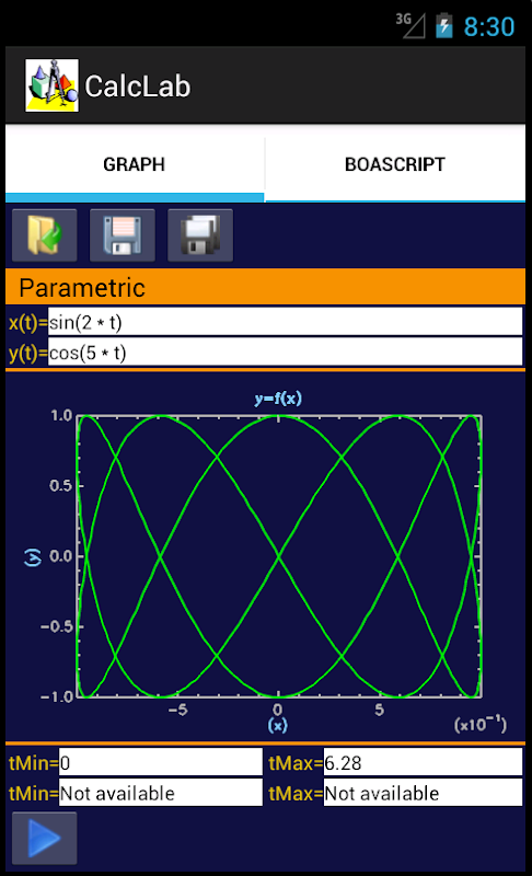 CalcLab é uma calculadora gráfica (também calculadora gráfica / gráfico) refere-se a uma classe de calculadoras científicas que são capazes de (cartesianas duas e três dimensões, Polar e Parametric) cálculos e realizando BoaScript utilizando linguagem de script traçar gráficos. BoaScript tem uma sintaxe estilo C e permite realizar os cálculos em uma vasta gama - a partir de cálculos aritméticos e trigonométricas de soluções numéricas complexas.