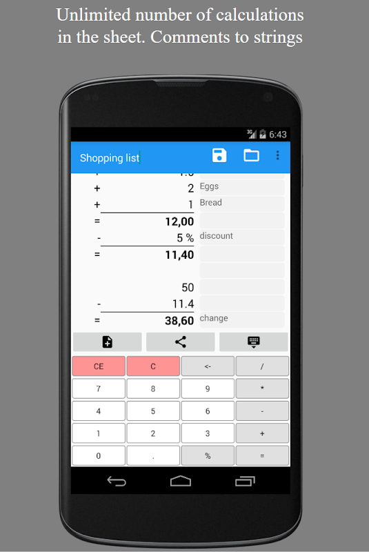CalcuLate é uma calculadora de fita com a capacidade de salvar e editar