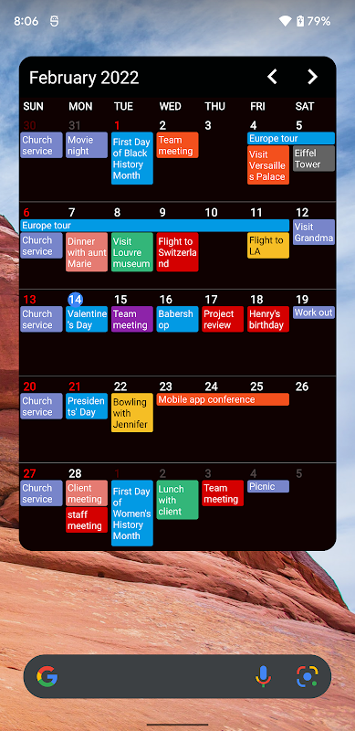 ▪ Visualização Versátil: Exiba seus eventos por dia, semana ou mês. Escolha entre vários temas de cores.