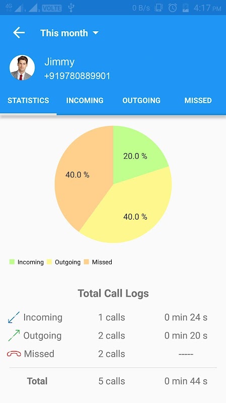 Contact Details: User can tap on any of the call log to see contact details of a specific contact. You can also see the statistics of calls and messages made between that contact.
