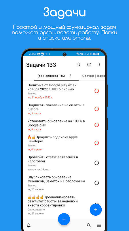 ・Tarefas - uma lista de tarefas simples e poderosa que o ajudará a organizar sua vida e seu trabalho. Você pode agrupar tarefas em pastas e quadros (listas ou etapas). Você pode definir uma data para uma tarefa. Se precisar de campos adicionais, comentários ou vincular contatos a tarefas, você pode adicioná-los com apenas alguns cliques. Existem também configurações flexíveis para exibir a lista