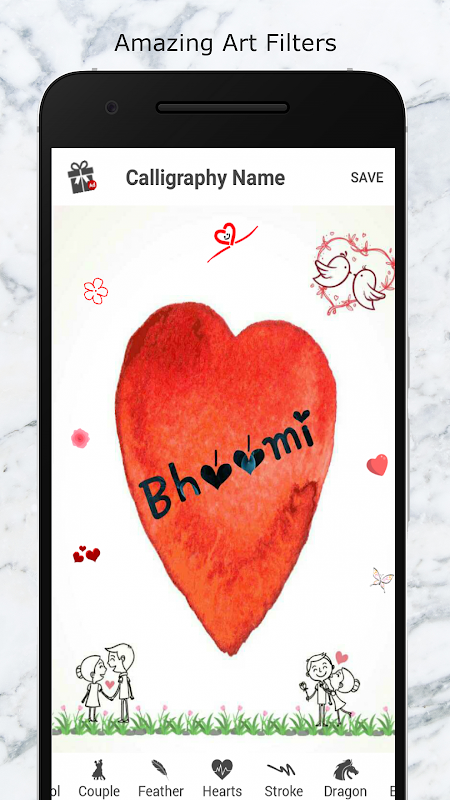 You can write your name or nickname or any text with different styles & decorate it with different decorative items like heart shapes, strokes, feathers, different colorful background frames, color filters, love stickers & many more.