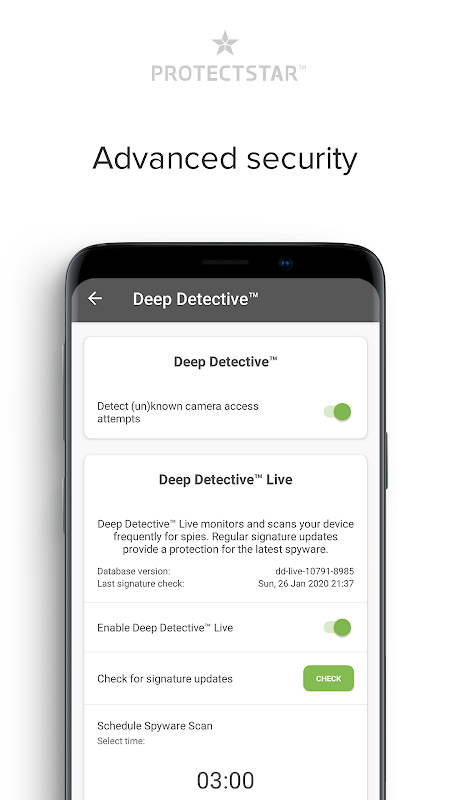 O Camera Guard™ pode, especialmente com o Deep Detective™ ativado, ser utilizado em combinação com outras soluções de segurança já existentes, como varreduras antivírus ou firewalls. Ele também funciona perfeitamente com o Micro Guard™ para Android™ da ProtectStar, que também protege a microfone integrada do seu dispositivo.