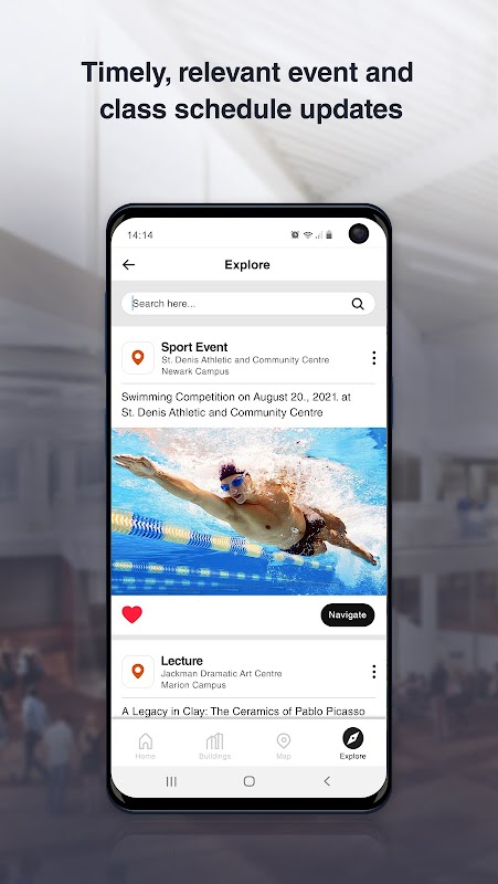 O recurso de pesquisa inteligente e sugestiva do CampusGo facilita a localização das salas de aula, eventos e serviços que você procura. Mais do que apenas um ótimo aplicativo de navegação no campus, você pode usar o diretório interativo do CampusGo para encontrar opções de restaurantes na praça de alimentação, descobrir quais eventos estão acontecendo no campus e escolher a melhor maneira de navegar até lá para um multifuncional sem esforço app experiência no campus. Você também pode navegar por categoria ou nome para descobrir os eventos em que possa estar interessado e explorar o campus de uma maneira totalmente nova com um dos melhores aplicativos de campus disponíveis hoje.
