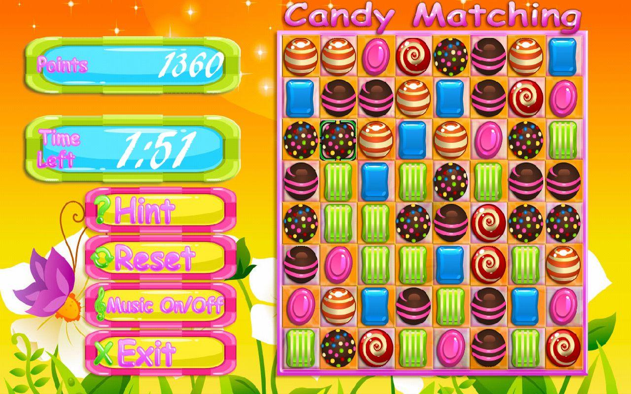 This game is very simple - match 3 or more of the sweet candy jewels as fast as you can, get many points, have lots of fun and become the champion of Candy Matching.