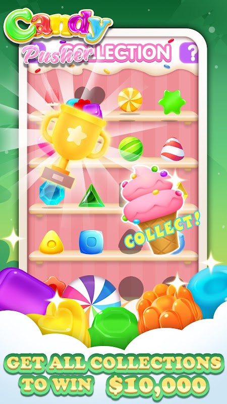 Join the millions of people playing Candy Pusher. Master the mania of this addictive coin dropping game to win brand-new jackpot and slot machines. Relax, push coins, and collect all the delicious candy prizes!