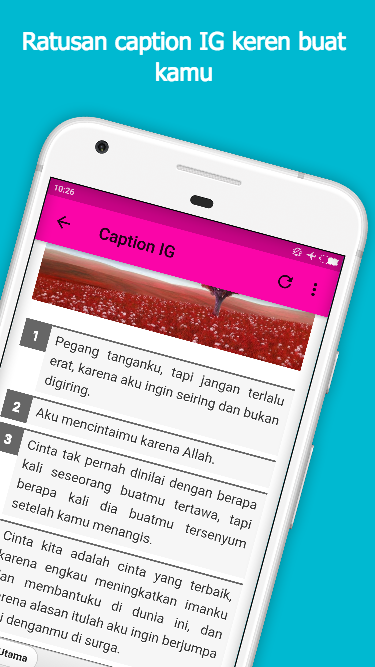 Aplikasi Caption IG Bahasa Indonesia merupakan suatu media yang memuat berbagai kutipan serta quotes yang bisa dijadikan sebagai Caption IG, memang jaman sekarang itu media sosial sangat marak sekali banyak anak muda yang menggunakan sosial media seperti Instagram sebagai ajang untuk berekspresi.