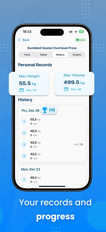 Acompanhe seus registros pessoais e cálculos máximos de uma repetição