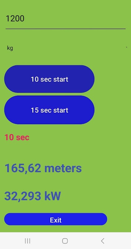 Monte o telefone na vertical, se possível. Em seguida, clique em Iniciar e dirigir. Não há necessidade de olhar para o aplicativo, pois ele registrará a potência máxima em quilowatts após o término do tempo selecionado. A distância percorrida e o tempo em segundos também são exibidos.
