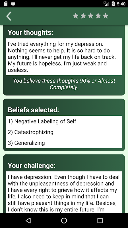 • Totalmente personalizável: altere os termos da TCC (crenças e definições) usados no diário para se adequar ao sistema com o qual você está familiarizado, adicione suas próprias declarações desafiadoras para cada crença, adicione humores/emoções, adicione atividades saudáveis para rastrear