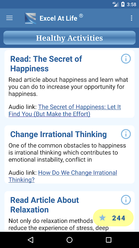 Ferramentas de CBT para uma vida saudável da Excel At Life ensina como usar os métodos de terapia cognitivo-comportamental (CBT) em um formato simples. As ferramentas fornecidas neste aplicativo são derivadas da base de pesquisa da TCC e desenvolvidas em um formato amigável por um psicólogo com mais de 30 anos de experiência clínica.