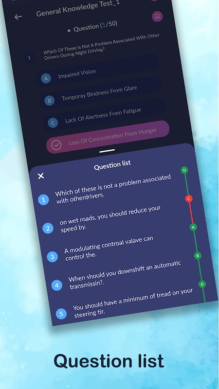 Você pode se preparar para o exame de carteira de motorista comercial (CDL) para Classe A, B ou C. O teste DMV CDL oferece diferentes conjuntos de perguntas para os respeitados estados dos EUA selecionados. Serão várias perguntas baseadas em opções. Selecione a opção correta como resposta.