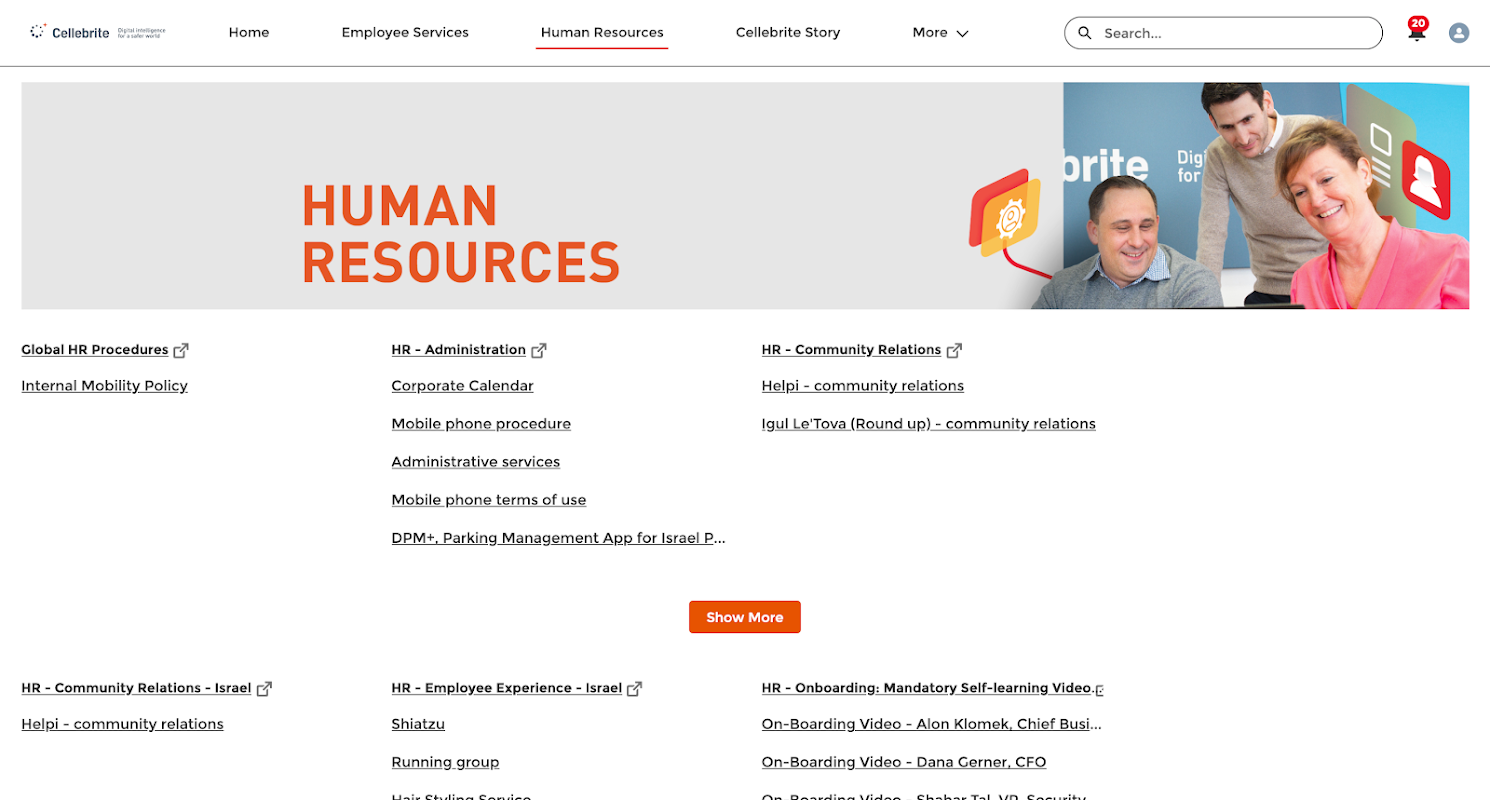 A plataforma de comunicações internas da Cellebrite inclui toneladas de informações úteis e serve como uma porta de entrada para todos os nossos funcionários precisarem melhorar sua experiência de trabalho na Cellebrite: