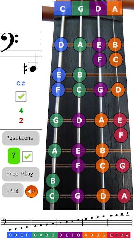 - Language for the displayed notes placements names on the cello fingerboard and helping staff : Latin, English, German (other languages displays notes placements and helping staff in english)