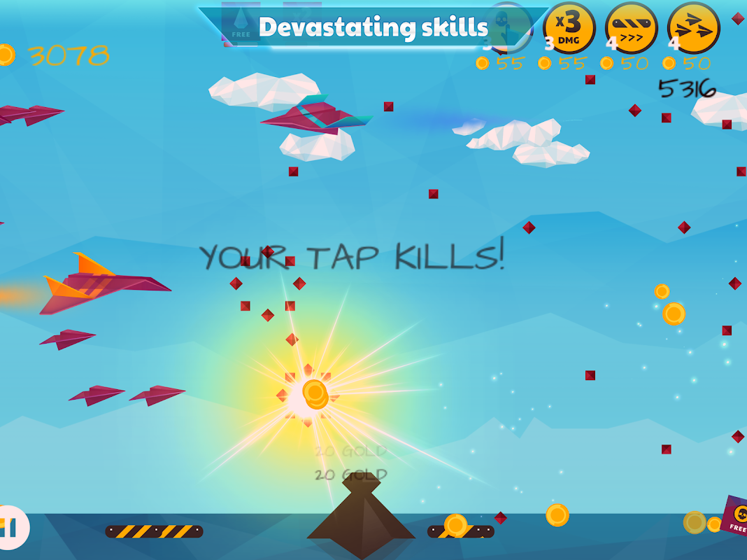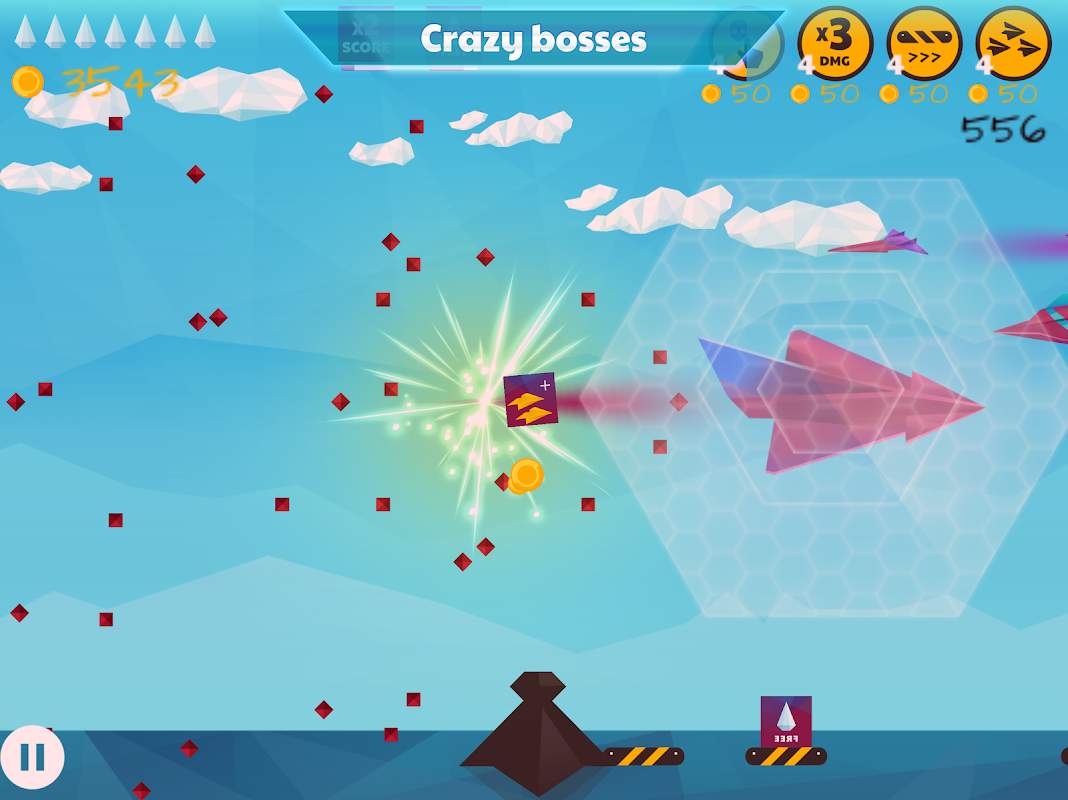 Buy more helpers and upgrade your arsenal! Intensify your gameplay with more and more booster slots, minions and an easier way to get above the critical mass. Use special skills to take down the strongest boss ships for lavish loot! Destroy your enemies with one godly touch or triple your bullets to defeat more ships!