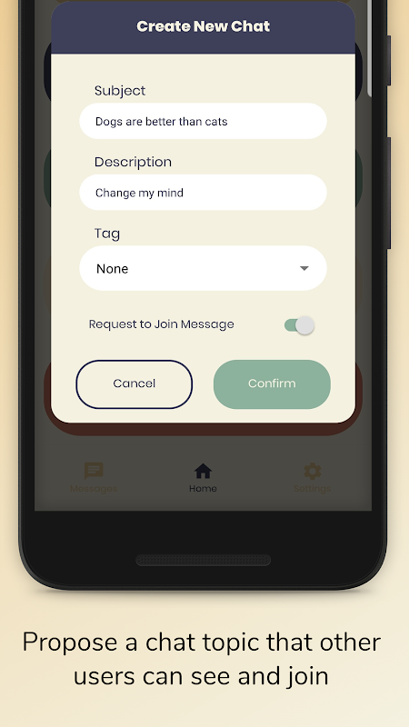 Create chats on topics of your choice that other users can join, or search through chats that other users have proposed to find one that takes your fancy.