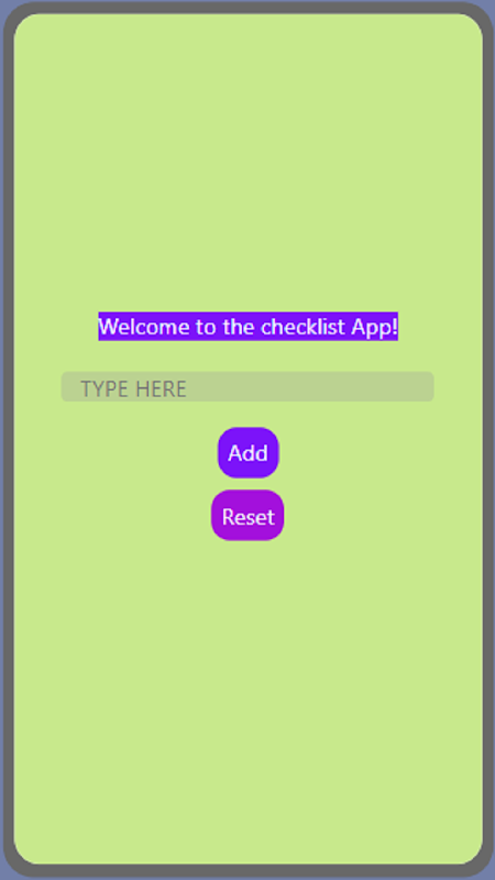 Depois que a tela frontal desaparecer, você encontrará uma tela que possui uma caixa de texto. Na caixa de texto você pode digitar qualquer mercearia que desejar e adicioná-la à sua lista de verificação. Depois de comprar esse item, você pode mudar a pequena barra para azul. Quando todos os itens forem comprados, você poderá clicar no botão "Redefinir".
