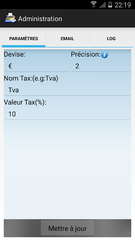 Com a funcionalidade de administração você pode definir sua aplicação, adicionando o nome e o valor do Imposto de seu país e sua moeda, e personalizar o e-mail de envio do arquivo de exportação de dados.
