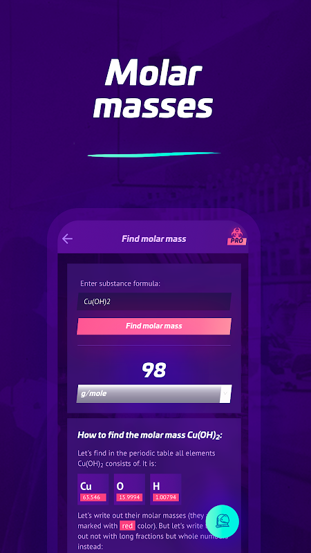 As fórmulas são divididas em partes de valores: massa, massa molar, etc.
