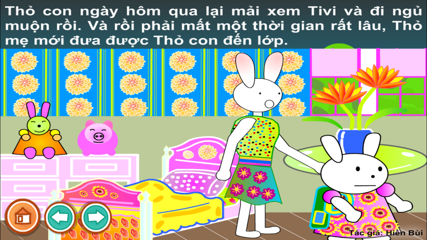 Thỏ con hàng ngày hay thức khuya để xem TV nên sáng ra dậy rất muộn. Thỏ mẹ đánh thức thỏ con dậy để đi học rất vất vả.