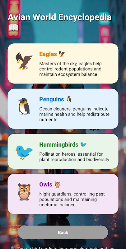 A Enciclopédia Interativa de Aves oferece dados abrangentes sobre diversas espécies de aves, incluindo beija-flores, águias, corujas e pinguins. Os usuários podem tocar nos cartões de espécies para acessar fatos animados, detalhes ecológicos, características físicas e insights comportamentais — tornando o aprendizado divertido e informativo. Demonstração da Chicken Road.