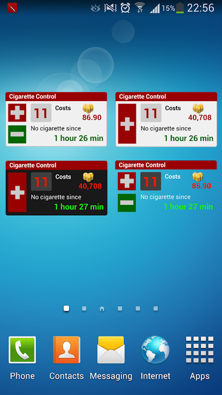 - Widget - número total de cigarros, acrescentando mais um cigarro, rastreia os custos eo tempo decorrido desde o último cigarro