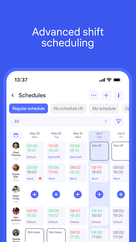 Agendamento de turnos: crie horários de trabalho ou licença para um único dia ou período. Ele pode ser atribuído a uma ou várias pessoas com horário de início/término, intervalo, período de carência e muito mais. Clockster se oferece para criar programações básicas que podem ser atribuídas automaticamente a novas pessoas para ajudar você a economizar muito tempo. Ao mesmo tempo, as pessoas podem verificar sua programação real em seu aplicativo móvel para saber quando começar. Para economizar tempo, as pessoas podem gerenciar sua agenda por conta própria, simplesmente enviando solicitações aos seus gerentes. Após aprovação, o novo cronograma será aplicado em cima do existente.