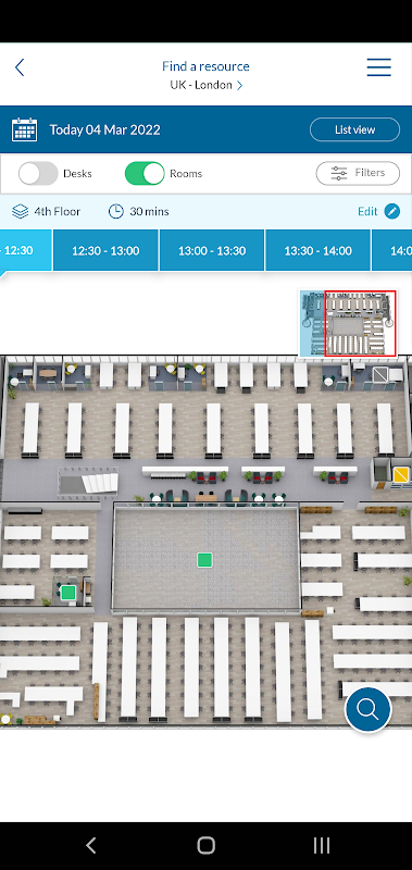 Encontre seus colegas e recursos em uma planta baixa interativa, para que você possa reservar mesas e salas próximas