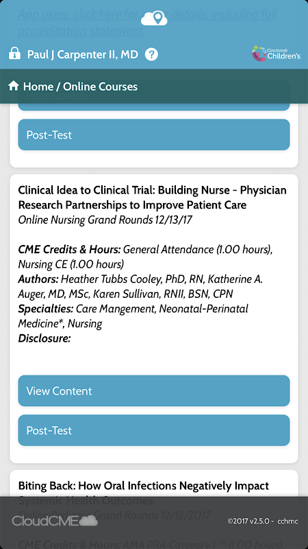 Use o aplicativo CloudCME ™ para completar a maioria de suas tarefas diárias CME diretamente no seu telefone ou tablet. Grave a sua própria participação em uma atividade de educação médica continuada e instantaneamente ter seus créditos registrados, obter transcrições, avaliações completas, ver e anotar apresentações e mais.