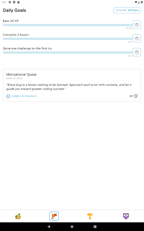 Com o Coddy, aprender parece um jogo. Você vai ganhar XP, desbloquear temas, colecionar conquistas e ver suas habilidades crescerem todo dia. Pratique código, resolva quebra-cabeças criativos e construa confiança, um desafio de cada vez.