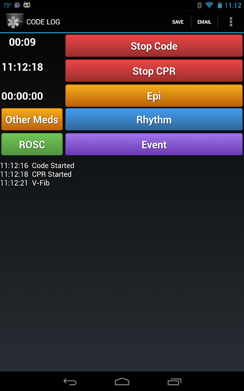 Code Log is a logging program that you can use to help remember the exact times that you performed all of the steps in your code. It gives you a chronograph to show how long the code was run. It timestamps your drugs given, events, rhythms and return of pulse. Code Log allows you to email the timestamps using your favorite email application. You can also save the log to your device so that you can look at it later (it will be saved to your root of your SD-Card). It can be used for more than just codes. You can use it to get real times on any call that you run.