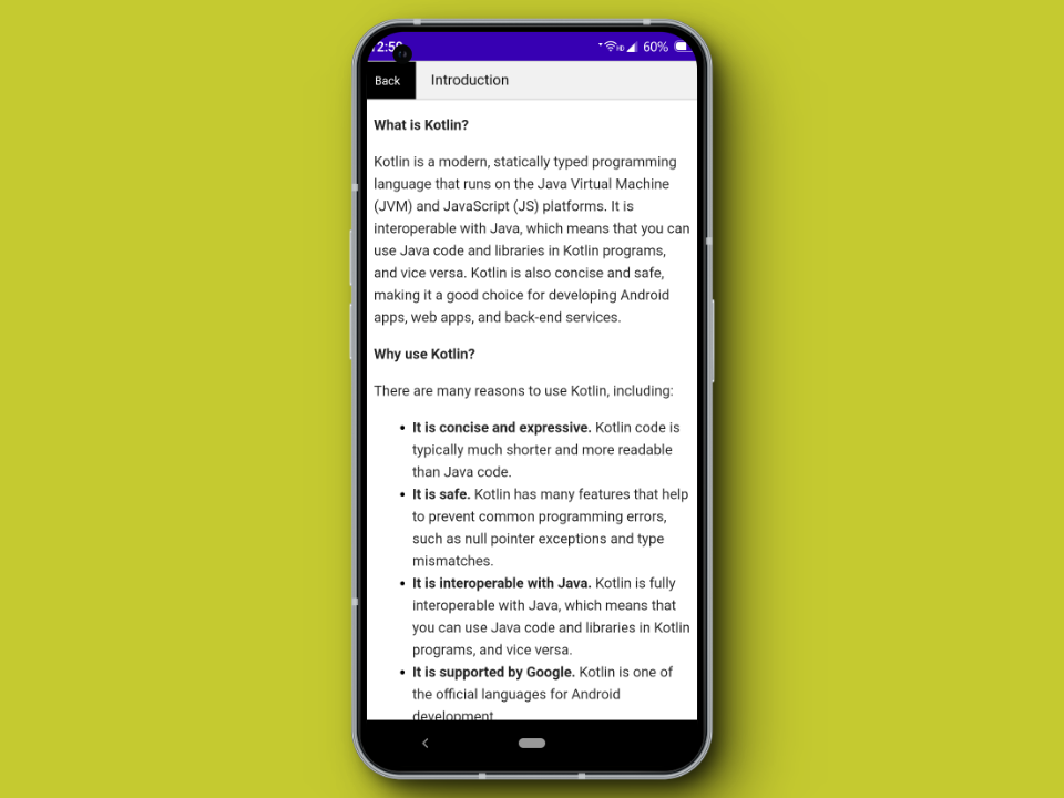 2. Conteúdo abrangente: mergulhe em uma variedade de tutoriais, explicações e exemplos de código que cobrem tópicos essenciais do Kotlin, incluindo variáveis, tipos de dados, estruturas de controle, classes e muito mais.