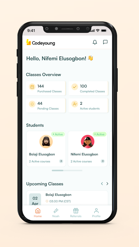 Fique perfeitamente conectado com a jornada educacional do seu filho usando o aplicativo Codeyoung! Nossa plataforma intuitiva permite que os pais monitorem e gerenciem facilmente as aulas on-line de seus filhos, garantindo uma experiência de aprendizagem tranquila e informada.