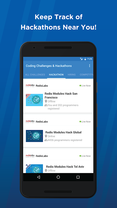 2) Hackathons: Discover and participate in the best hackathons and coding contests around the world. Showcase your ideas, develop new products and code your way to great prizes. Bringing the best of competitive programming, to your mobile phone!