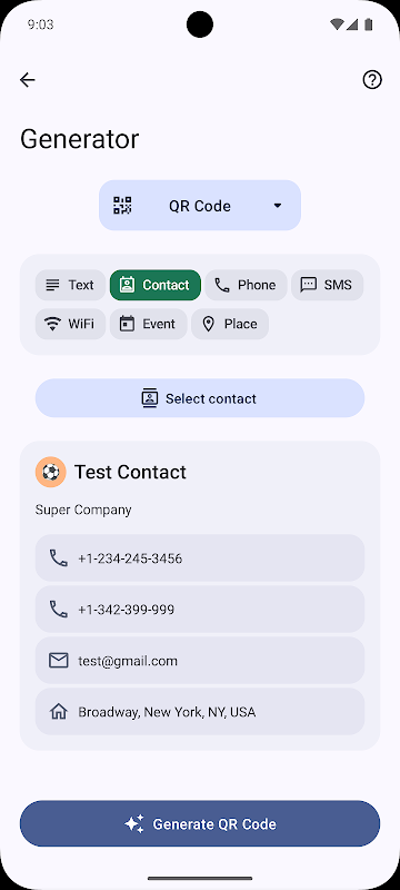 Gere códigos QR de diferentes tipos. Os seguintes tipos estão disponíveis: