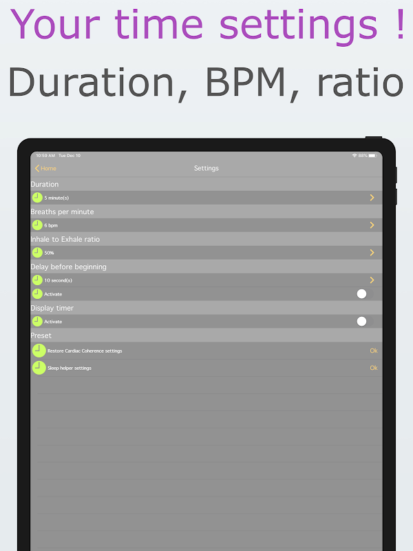 - customize the Inhale to Exhale ratio (relaxing , coherence, energizing )