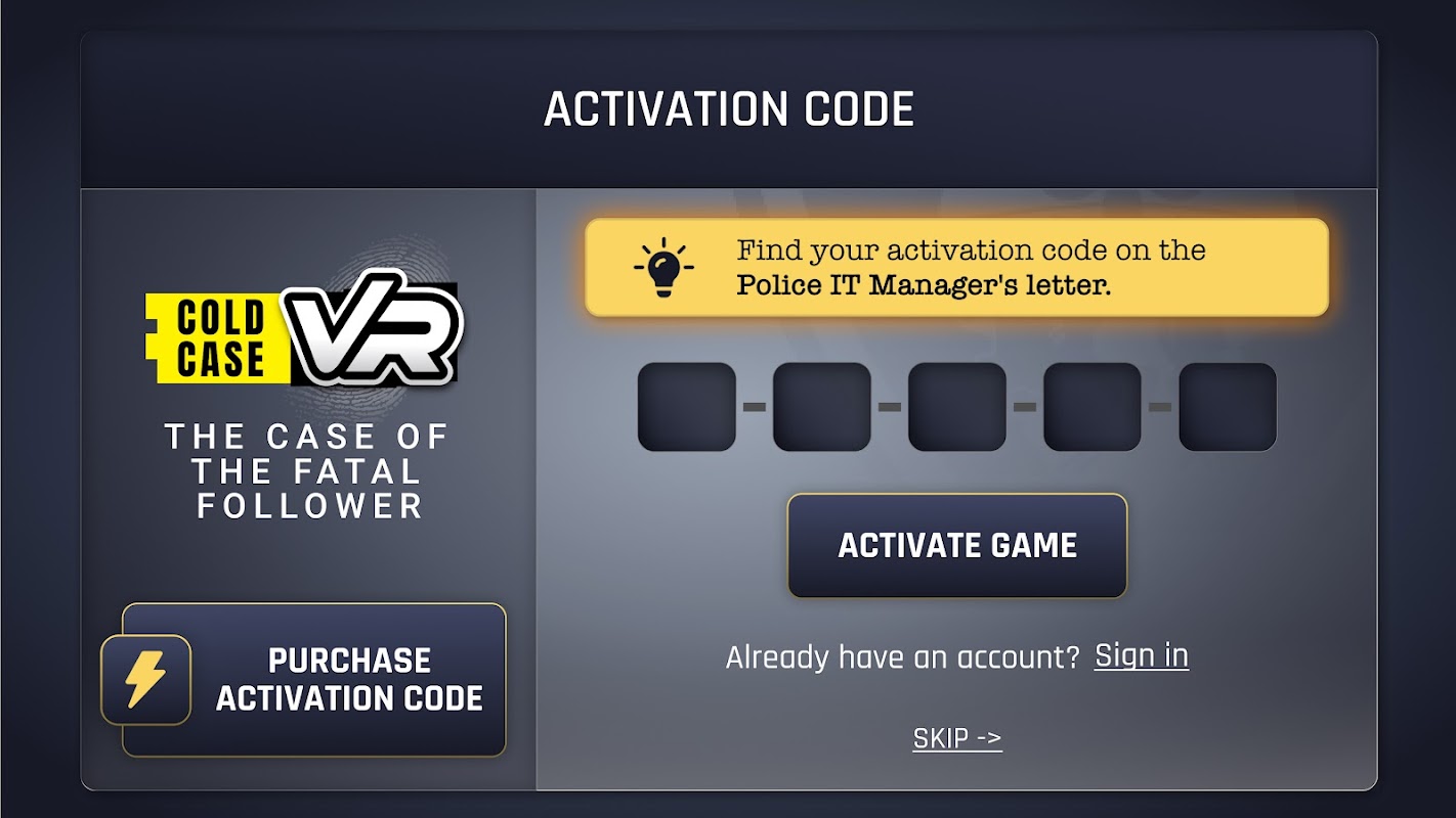 Cold Case VR é um aplicativo complementar desenvolvido para funcionar em conjunto com os materiais físicos incluídos na caixa de varejo do Cold Case VR. Escaneie as evidências físicas para completar objetivos no aplicativo e desbloquear experiências de VR correspondentes, dando vida à história de uma maneira totalmente nova.
