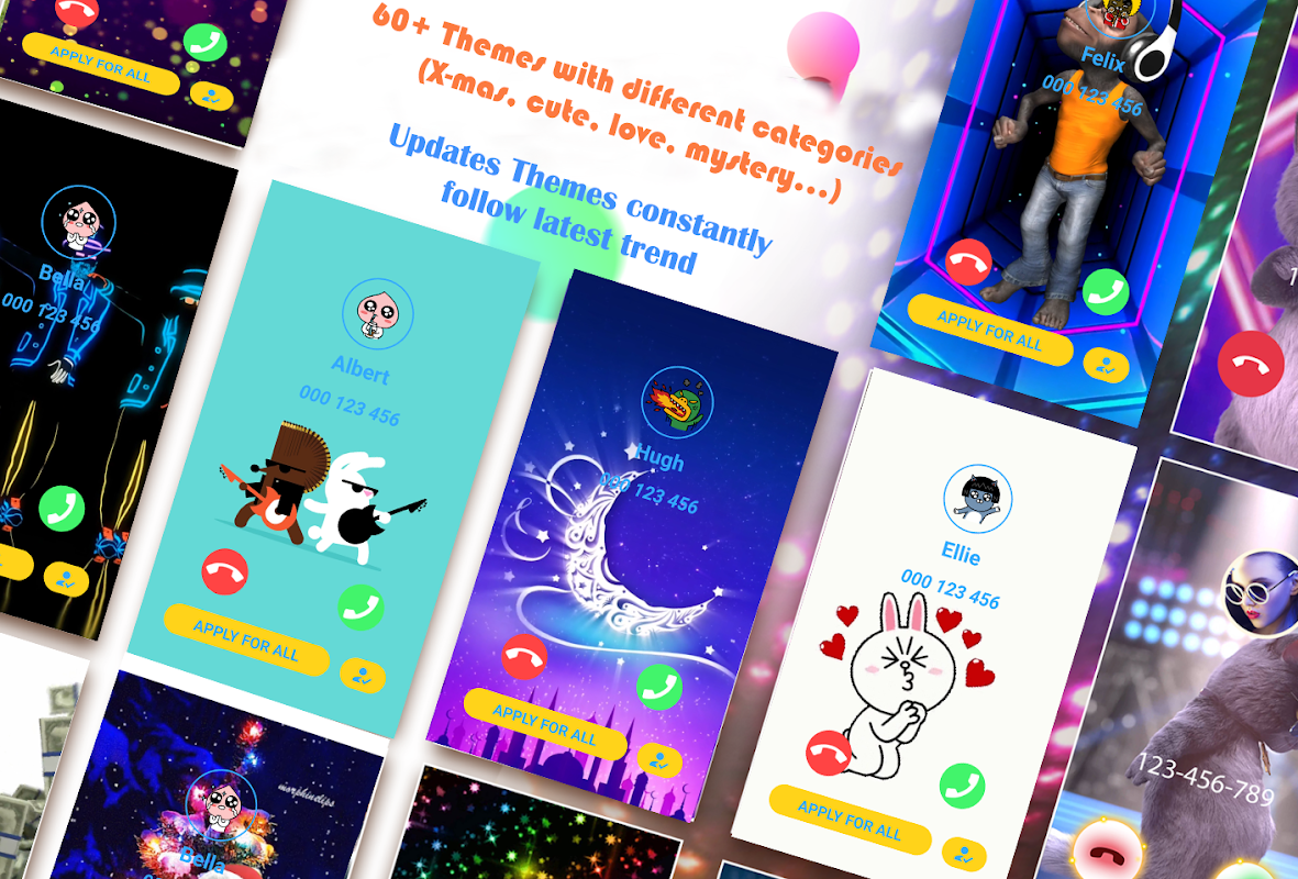 • Mais de 60 temas de cores em Flash : podem ser personalizados para contatos individuais, escolha temas exclusivos para cada um de seus contatos amados para que você possa reconhecer facilmente suas chamadas.
