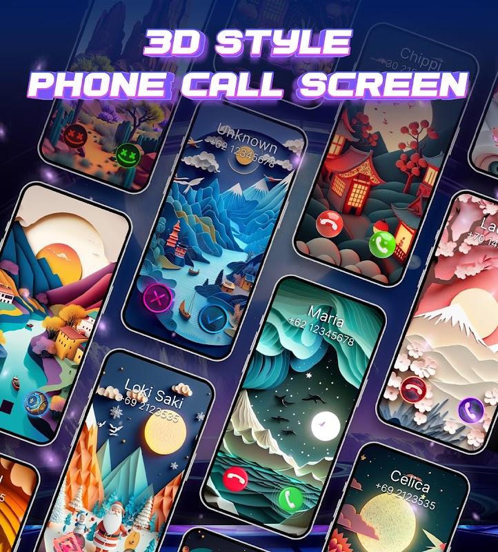 Select from over 11 different themes including Christmas, Anime, Animals, and more, all crafted with artistic flair and high-quality imagery. Instantly personalize your call screen for both incoming and outgoing calls with just a few taps.