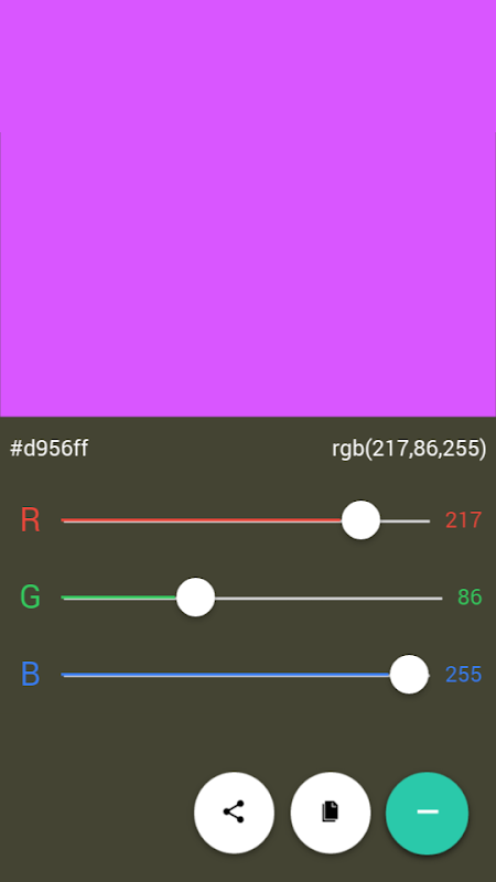Color Pick es una aplicación muy fácil de usar, solo debes mover los valores de cada RGB, y se mostrara el color en la parte superior en tiempo real, una vez encontrado el color puedes seleccionar los valores de HEX o RGB y se copiarán al portapapeles, o presionar el botón con signo “+” y saldrán 2 opciones, la primera será para compartir el código del color escogido y la segunda será para copiarlo al portapapeles solo en formato hexadecimal.