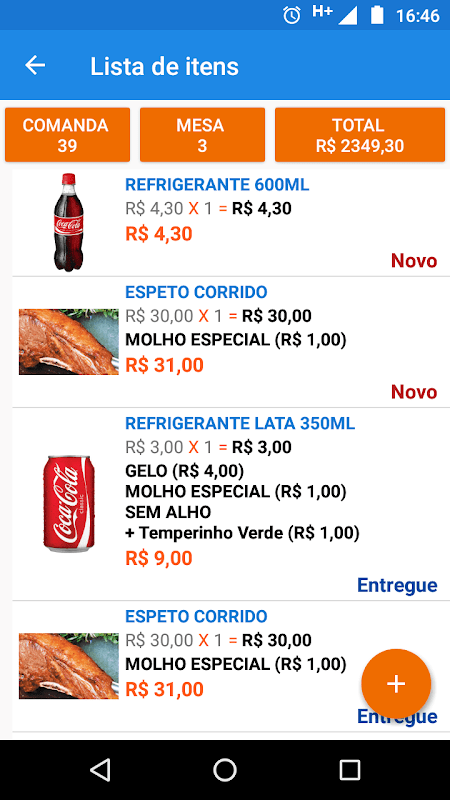 • Acompanhamento da situação (STATUS) do item da comanda: Novo, Em Produção, Aguardando Entrega e Entregue