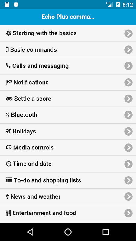 From this app, you will get full list of commands for your Echo Plus. All are organised by category. So you can find easily any command you need.