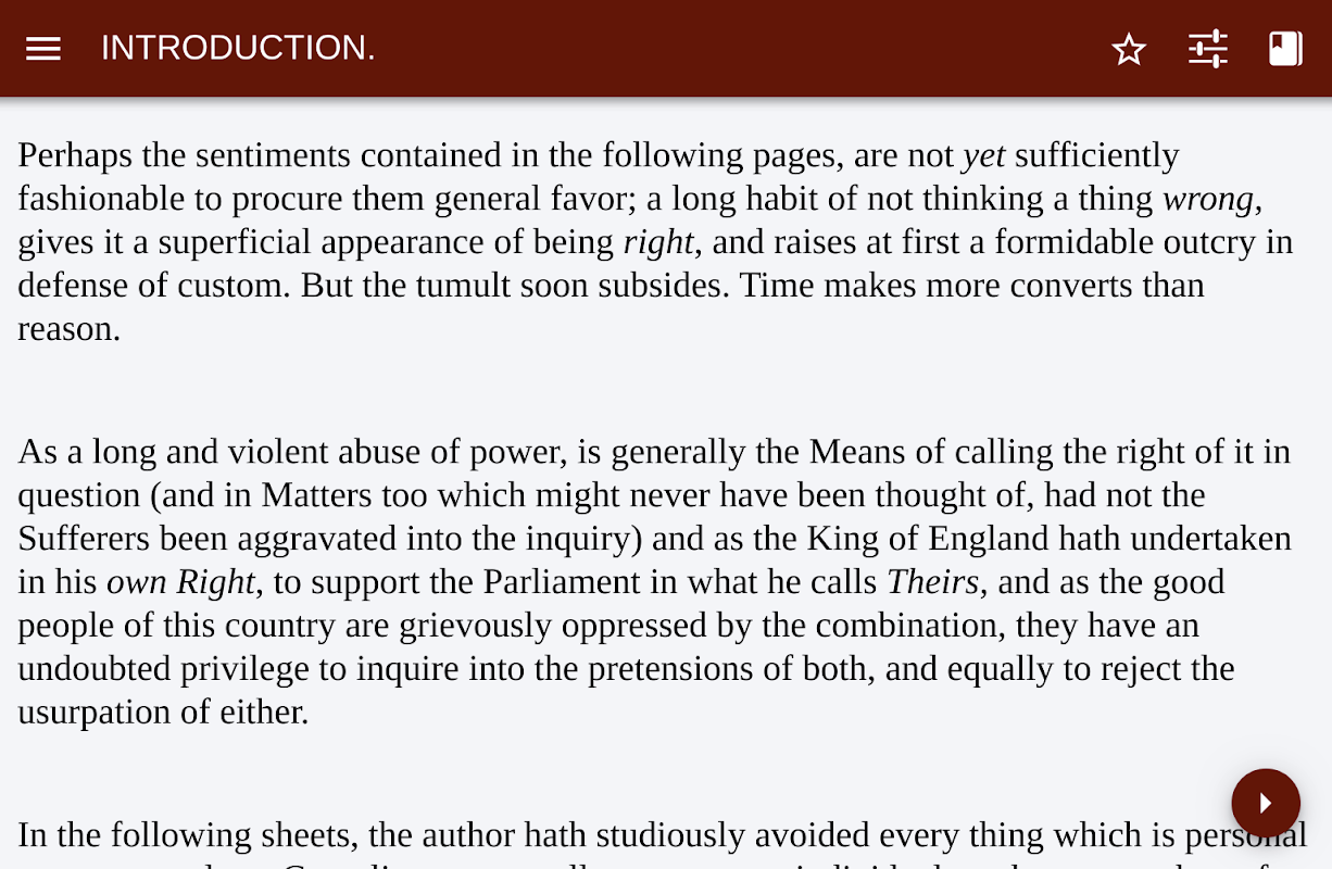 In Common Sense, Thomas Paine argues for American independence. His argument begins with more general, theoretical reflections about government and religion, then progresses onto the specifics of the colonial situation.
