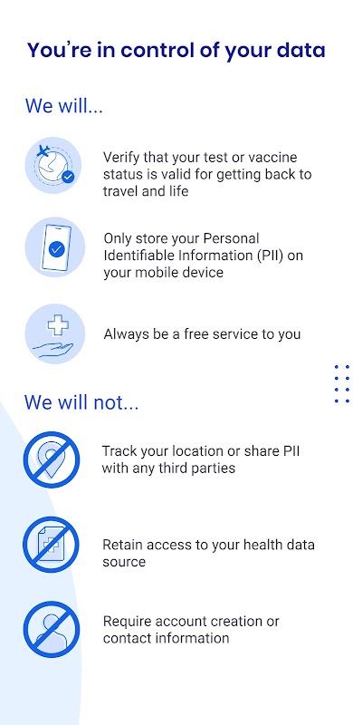 CommonPass gera um código QR seguro para você mostrar quando você viaja ou acessa certos locais e eventos. Seus registros de saúde são armazenados de forma segura e privada em seu telefone, totalmente sob seu controle. Com o seu consentimento, essas informações podem ser usadas para validar o seu estado de saúde sem revelar quaisquer outras informações pessoais de saúde subjacentes.