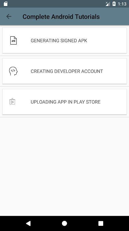 This app provides you knowledge from what is Android, How to install Android Studio to How to upload you app, how to monetize with your app.
