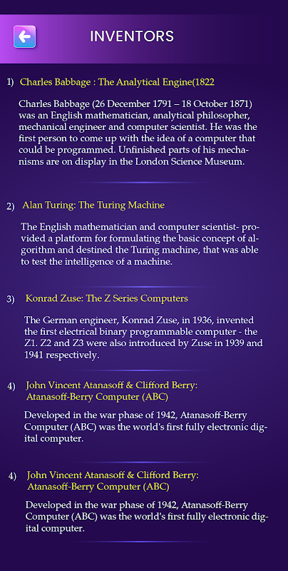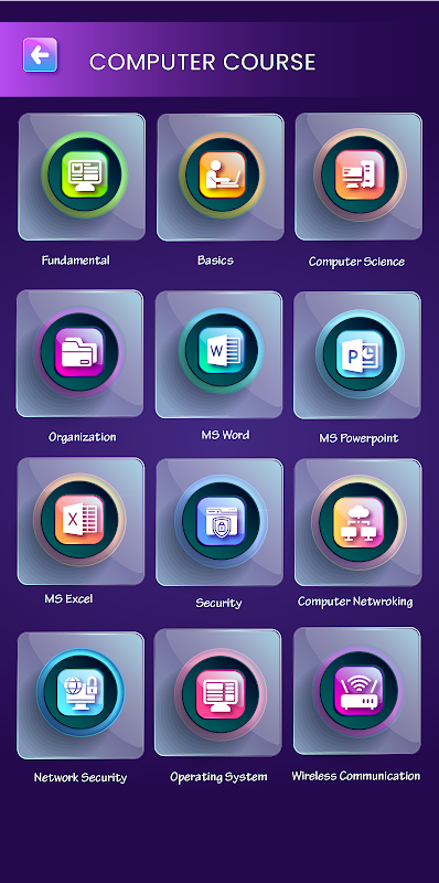 O aplicativo do curso de computador abrange os seguintes tópicos importantes