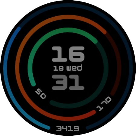 Concentric é um mostrador de relógio digital para Wear OS. No centro brilha a hora no formato 12h ou 24h e entre horas e minutos está sempre presente a data. O núcleo é circundado por três barras circulares. O verde no interior fornece a porcentagem da bateria, o vermelho mostra o valor dos batimentos cardíacos e o último os passos diários. Tocar na data em que o calendário será aberto, tocar no valor do nível da bateria abrirá o menu relativo, enquanto acima do valor das etapas existe um atalho personalizável, no que diz respeito aos batimentos cardíacos, consulte a nota abaixo.