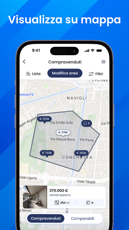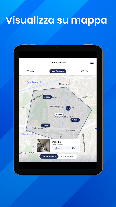Os Comparáveis representam os imóveis à venda nos principais portais imobiliários italianos. Poderá consultar instantaneamente as principais informações, como morada, superfície, número de quartos e data de publicação. Com um simples clique você acessará diretamente o edital no portal, onde encontrará fotos, descrições e todos os detalhes disponíveis.
